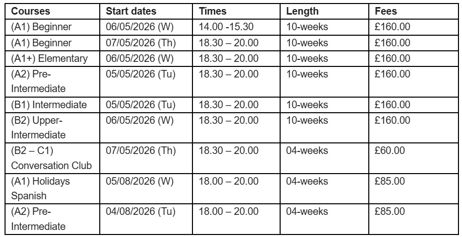 | (B1) Spanish Alevel/Alevel2 | Please contact us for details | 19:00-20.30 | 20 Weeks + 4 private tuition lessons | £420 |